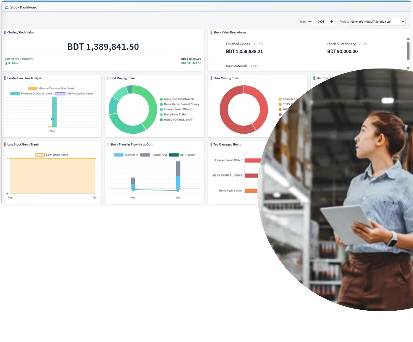 A quick snapshot of on-hand stock, valuation, and key stock indicators across warehouses for day-to-day monitoring.